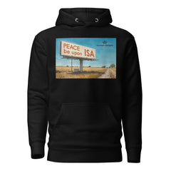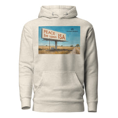This hoodie features a very simple, artistic illustration of a billboard that reads “Peace Be Upon Isa”. The design is intentionally minimal — because sometimes the quietest messages carry the most weight.